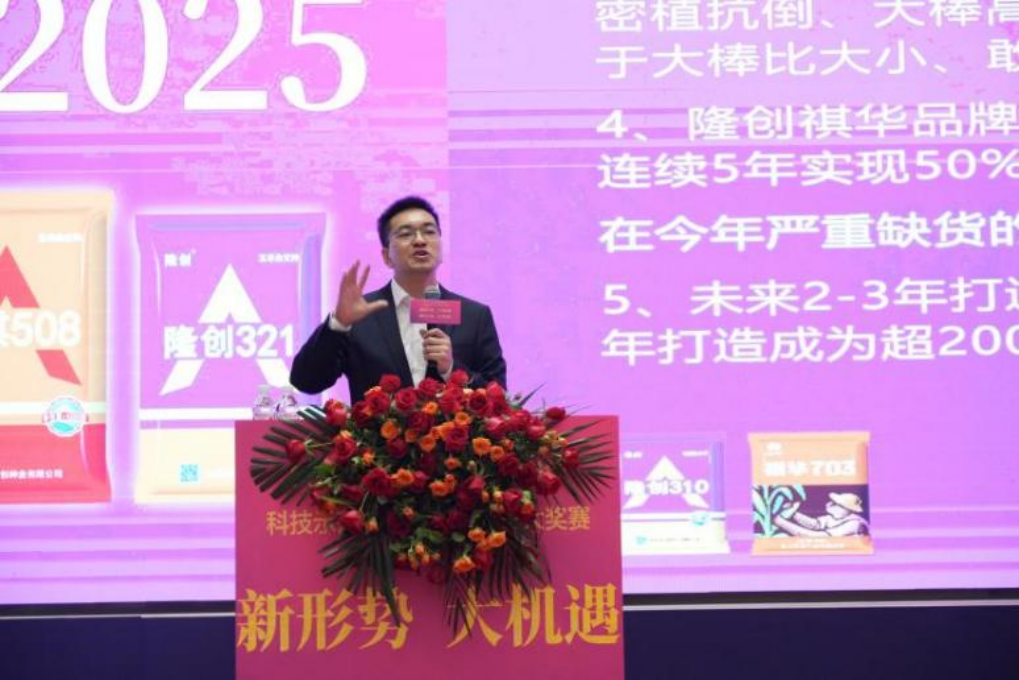 朱启帅以《携手隆创祺华共赢种业未来》为题,围绕隆创祺华品牌的现状和发展、上阶段工作成绩、各项政策、下阶段具体工作四个方面进行了详细阐述。朱启帅表示,隆创祺华自2019年成立以来,一路逆势而上,乘风破浪,向下扎根,向上生长,实现了连续5年销量增幅50%。在2023—2024年度,隆创祺华全面践行SAVE营销,以玉米牛人高产王大奖赛为主线,认真落实“大示范、大宣传、大观摩、大订购、大兑现、大管理和大服务”营销举措,实现隆创310、科祺508、祺华703、豫丰333等品种销量再创新高。