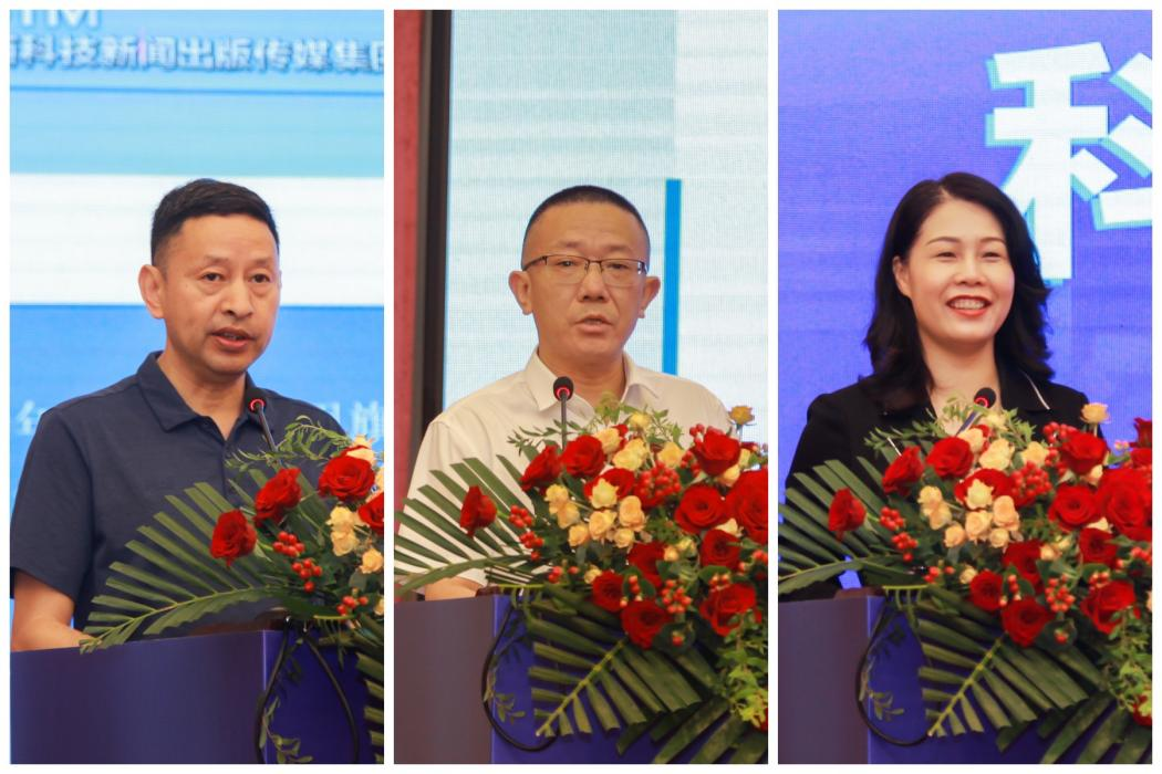 ▲ 山西科技传媒集团党委书记、董事长罗光明(左),湖南科技传媒集团董事长袁万茂(中),广西壮族自治区科普中心主任刘慧英(右)进行交流发言