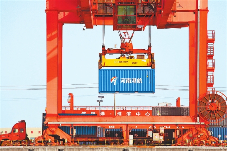 信阳港·淮滨中心港区,起重机在装运集装箱。 王长江 摄