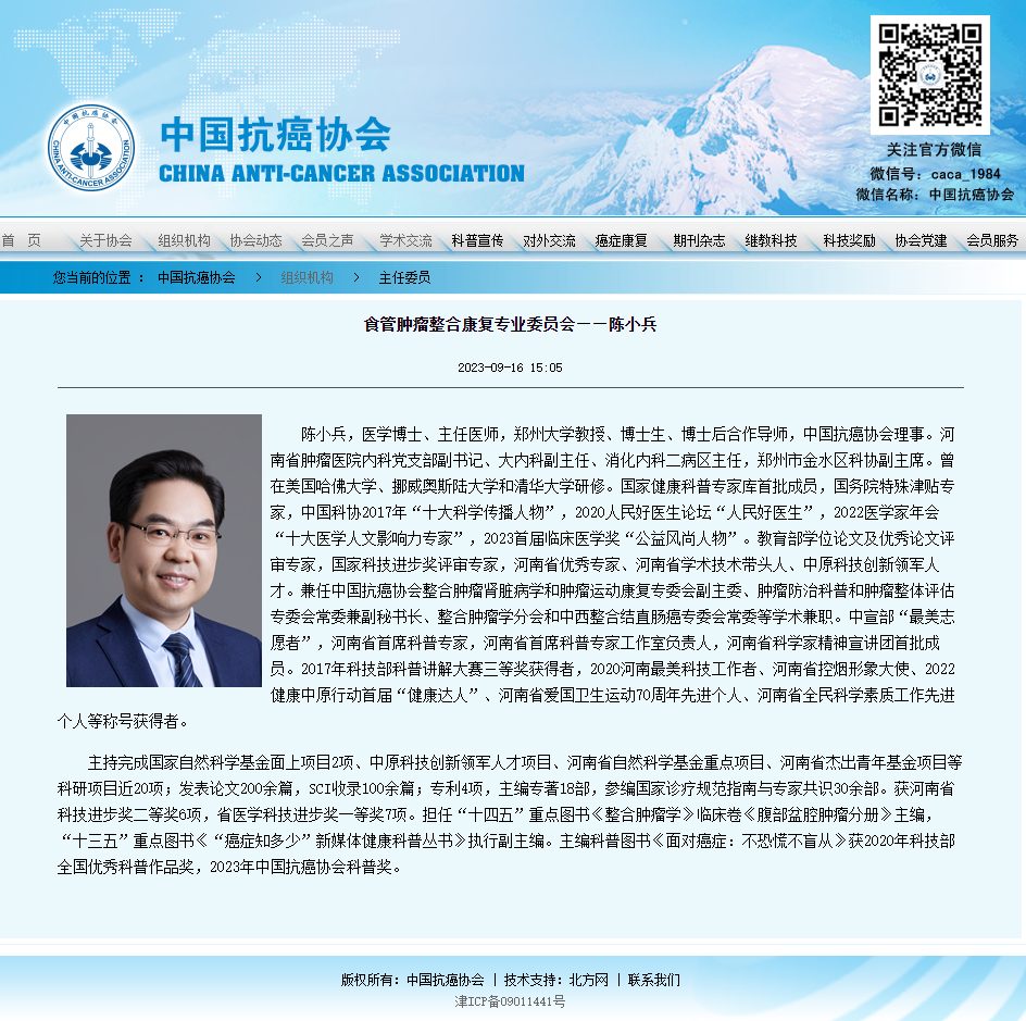 在中国抗癌协会的领导和监督下,成立大会全程公开、透明,经过全体委员投票选举,中国抗癌协会理事、河南省肿瘤医院内科副主任兼消化内科二病区主任、河南省科技新闻学会理事长、博士生导师陈小兵教授当选首届主任委员。