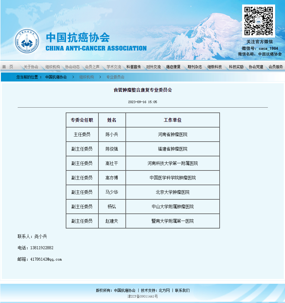 中国抗癌协会食管肿瘤整合康复专业委员会的成立实现对食管肿瘤患者的全程化、多元化整合康复指导的同时,搭建了专业的学术和患者的多样化交流平台,为食管肿瘤患者提供最新最权威的整合康复优质服务,推进食管肿瘤整合康复医学的发展。专委会将充分发挥专业引领作用,奋力开创食管肿瘤整合康复新局面,为践行“健康中国2030”的伟大目标尽一份自己的力量。