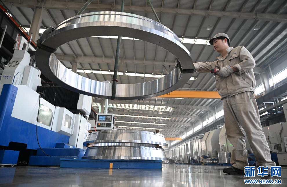 11月3日,工人在位于河南郑州的中铁装备集团车间检测盾构机刀盘。