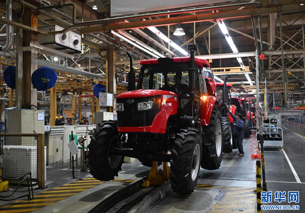 11月4日,工人在位于河南洛阳的国机集团中国一拖大轮拖总装线作业。
