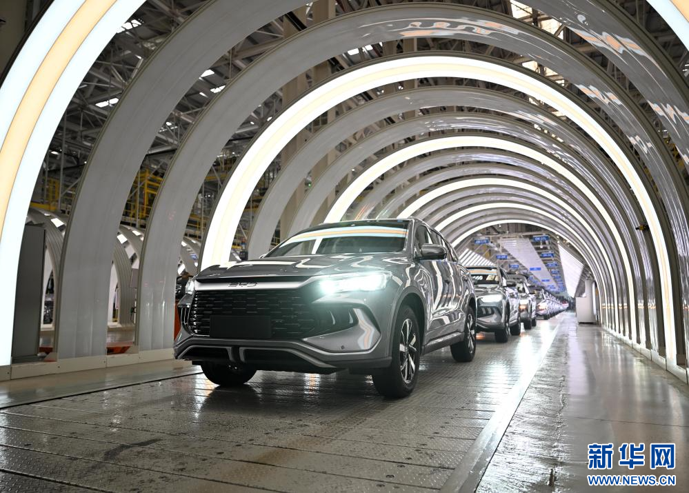 11月3日在郑州航空港区比亚迪总装工厂拍摄的新能源汽车“宋Pro”生产线。