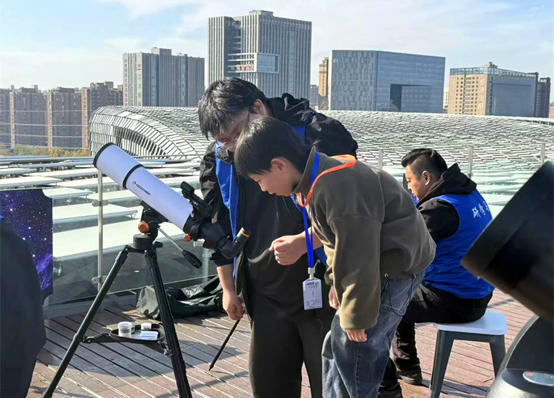 最令孩子们兴奋的环节是登上科技馆天台进行实地观测。在专业老师指导下,他们通过专业天文望远镜,不仅清晰观测到了太阳表面的黑子活动,还远眺了郑州地标“大玉米楼”的全貌,纷纷用笔记录下这难忘的瞬间。