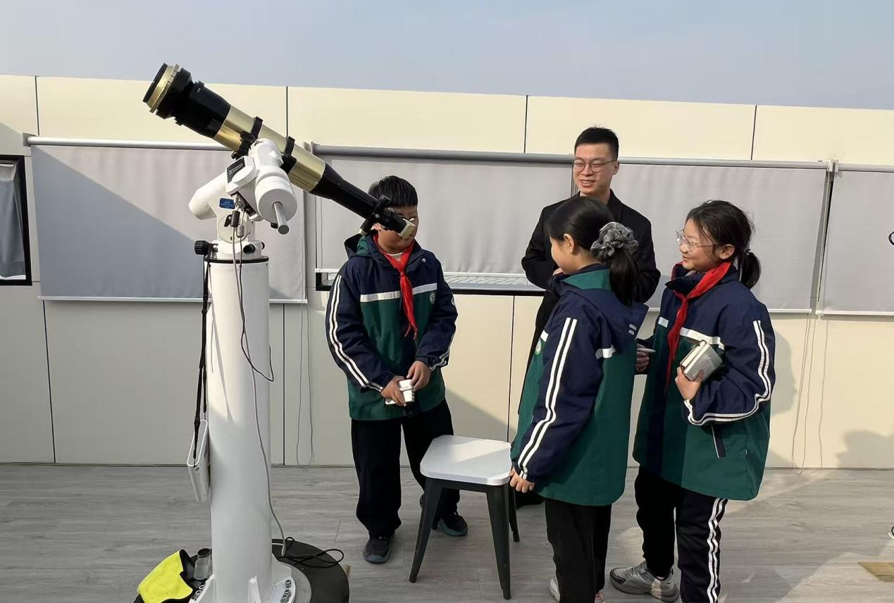 随后,老师带领同学们轮流使用配备专业太阳滤光镜的望远镜进行了观测。目镜中太阳表面的深色斑点太阳黑子便是最直观的观测目标,理论讲解中抽象的磁场活动现象,此刻化为了真实可辨的“太阳印记”。观测结束后,还特别引导同学们思考一些和太阳有关的日常现象,例如为何清晨的太阳呈现橙红色,而正午的太阳却看起来耀眼泛白?通过这样从星空回到身边的提问,将天文观测与日常生活现象联系起来,让参与者开始用不一样的眼光,重新打量这个熟悉的世界。