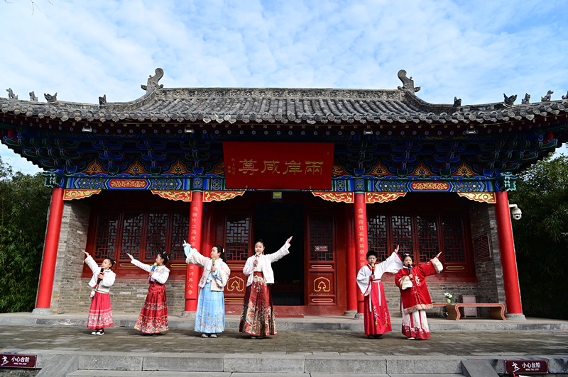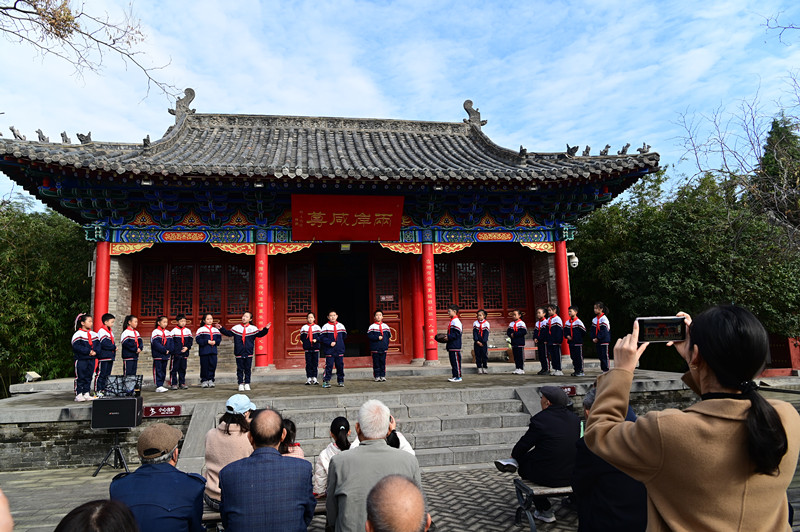 11月15日,在河南省沁阳市曹谨纪念馆,参加乙巳年纪念曹谨公诞辰238周年祭拜活动的沁阳市华儒国学馆的孩子们表演赞颂曹公的节目。