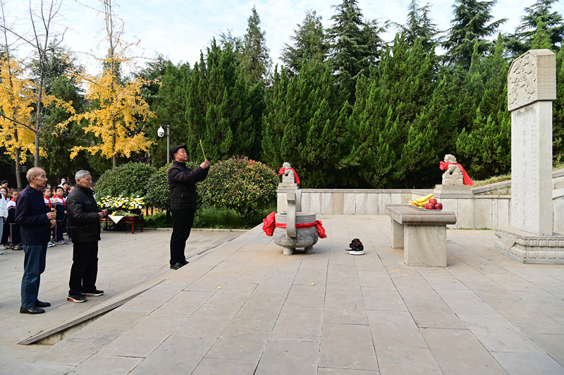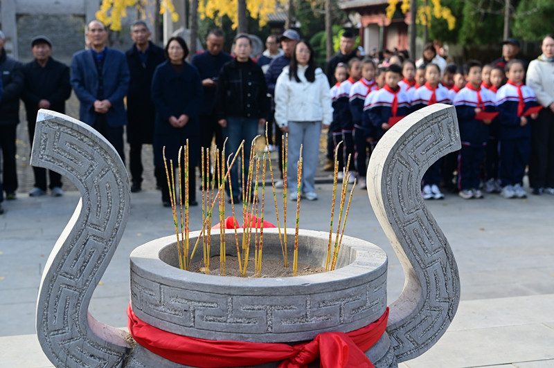 11月15日,在河南省沁阳市曹谨纪念馆,沁阳市实验小学师生参加乙巳年纪念曹谨公诞辰238周年祭拜活动。