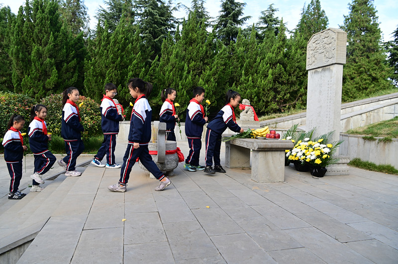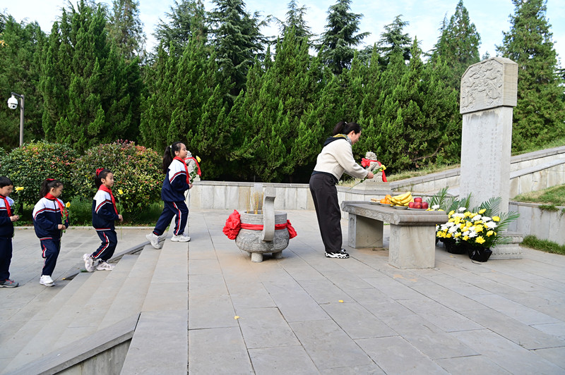 11月15日,在河南省沁阳市曹谨纪念馆,参加乙巳年纪念曹谨公诞辰238周年祭拜活动的沁阳市实验小学师生为曹谨墓献花。沁阳市实验小学与台湾国立曹公小学是姊妹学校。