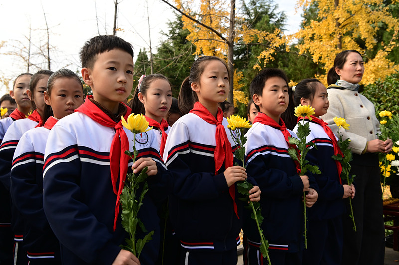 11月15日,在河南省沁阳市曹谨纪念馆,参加乙巳年纪念曹谨公诞辰238周年祭拜活动的沁阳市实验小学学生为曹谨墓献花。沁阳市实验小学与台湾国立曹公小学时是姊妹学校。