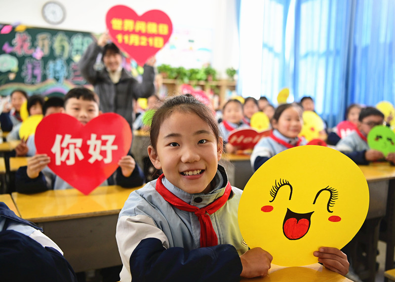 11月20日,沁阳市朱载堉学校三年级四班学生和老师手持卡通笑脸和问候卡表达祝福。