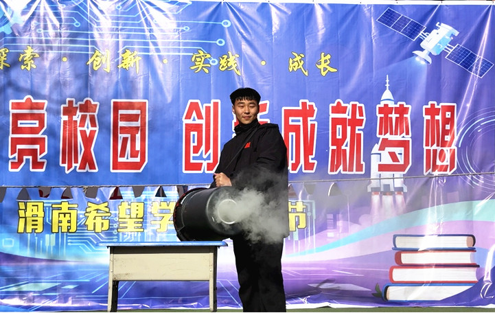 舞台环节更是高潮迭起,惊喜不断。“掌中火”与“悬浮的乒乓球”引来阵阵惊呼,无人机操控展示引得师生连连赞叹,“空气炮”“尖叫气球”“白色烟雾”等实验依次登场,以直观、有趣的方式揭示了科学原理。“水变雪”“不溢水取橘子”“不会湿的纸”及“隔空救球”等项目,则巧妙融合了知识与趣味,不断刷新着大家对科学的认知。