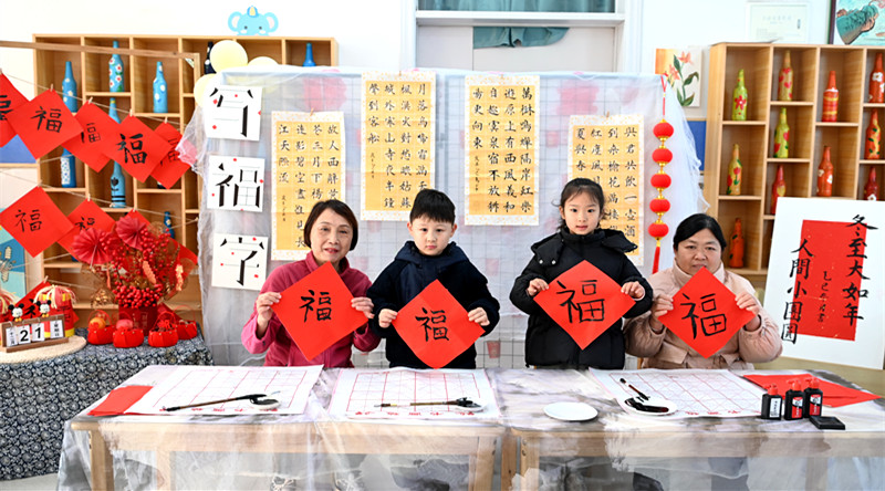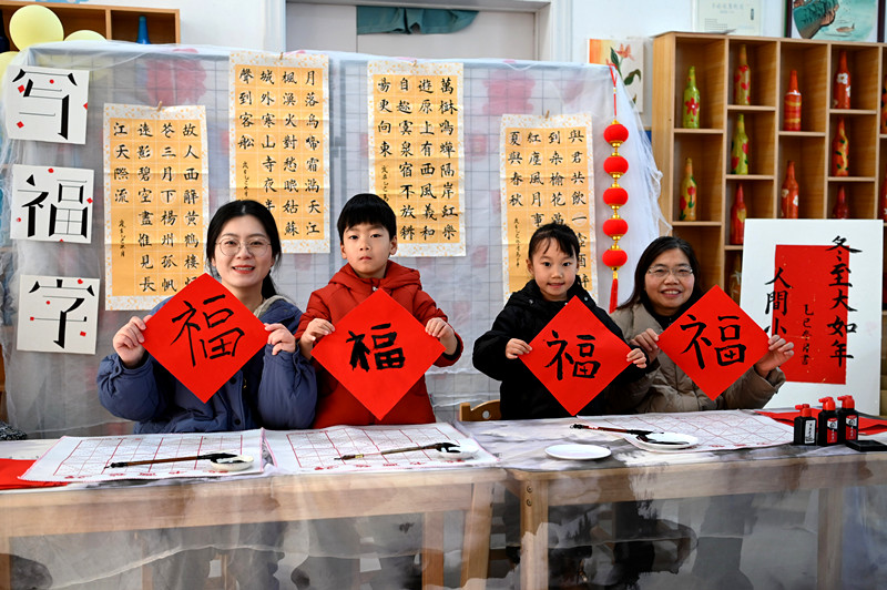 12月19日,在沁阳市第一幼儿教育集团白庄村幼儿园,家长和孩子展示她们书写的“福”字。