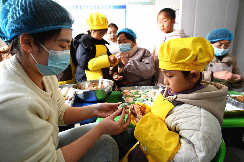 12月19日,在沁阳市第一幼儿教育集团白庄村幼儿园,老师、家长和孩子一起包饺子。