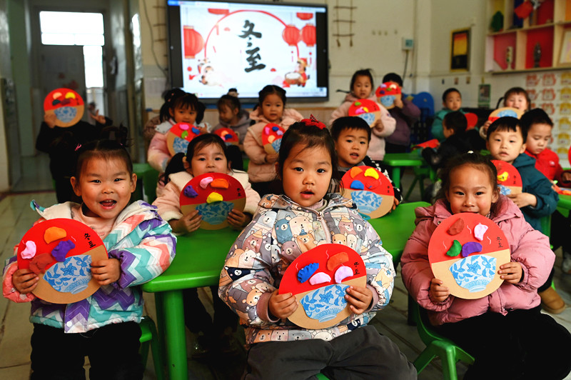 12月19日,在沁阳市第一幼儿教育集团白庄村幼儿园,老师向小朋友普及“冬至”知识。