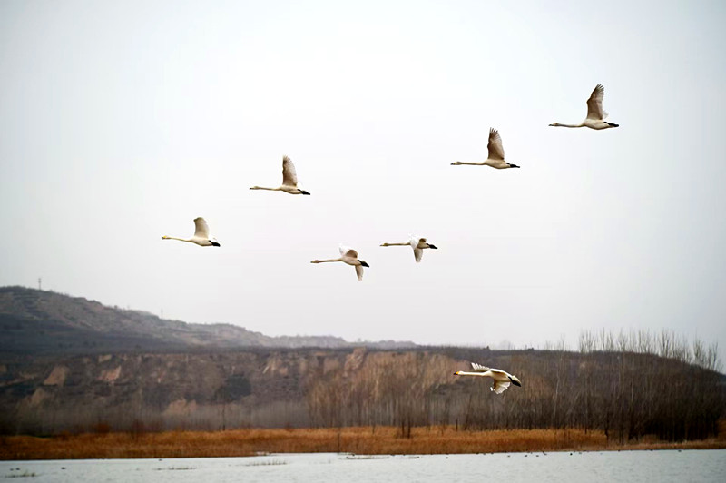 12月20日,白天鹅在三门峡市天鹅湖国家城市湿地公园上空飞翔。