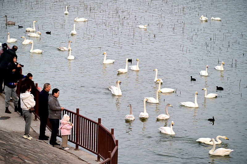 12月20日,游客在三门峡市天鹅湖国家城市湿地公园观赏白天鹅。