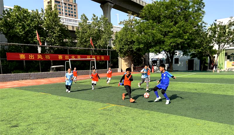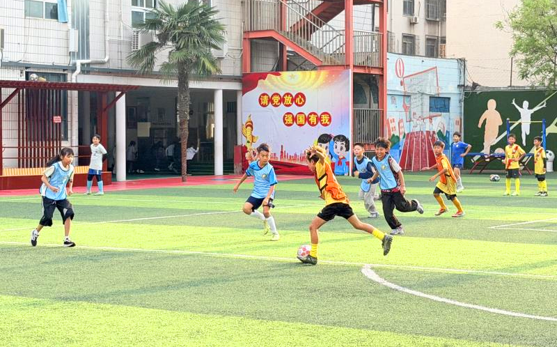 “传球!快!”“射门——好球!”每天下午,文化路三小的足球场上呐喊声此起彼伏。小球员们目光如炬,配合行云流水:精准的长传、果断的抢断、势大力沉的射门……每一个动作都透着平日训练的扎实功底。场外,各班啦啦队热情高涨,呐喊声、欢呼声、加油声此起彼伏,为赛场上的小将们注入源源不断的力量,成为绿茵场边最动人的风景。