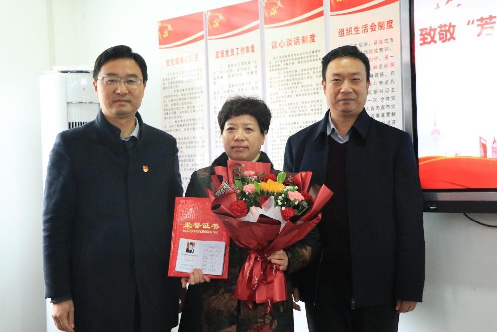 青年教师代表为三位老教师敬献鲜花,党总支部书记郭建波、校长裴拾阳分别为他们颁发光荣退休的荣誉证书和退休证,并合影留念。