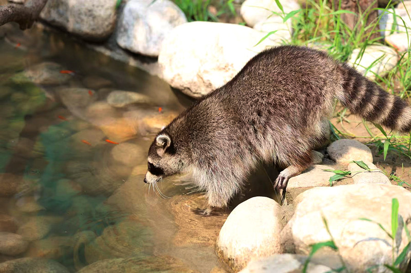 而在浣熊展区,为了满足它们极强的探索欲,专门设计了可供其翻找的枯树堆和可以游泳的水池,游客可以观赏到它们“洗”食物、掏树洞的滑稽模样。