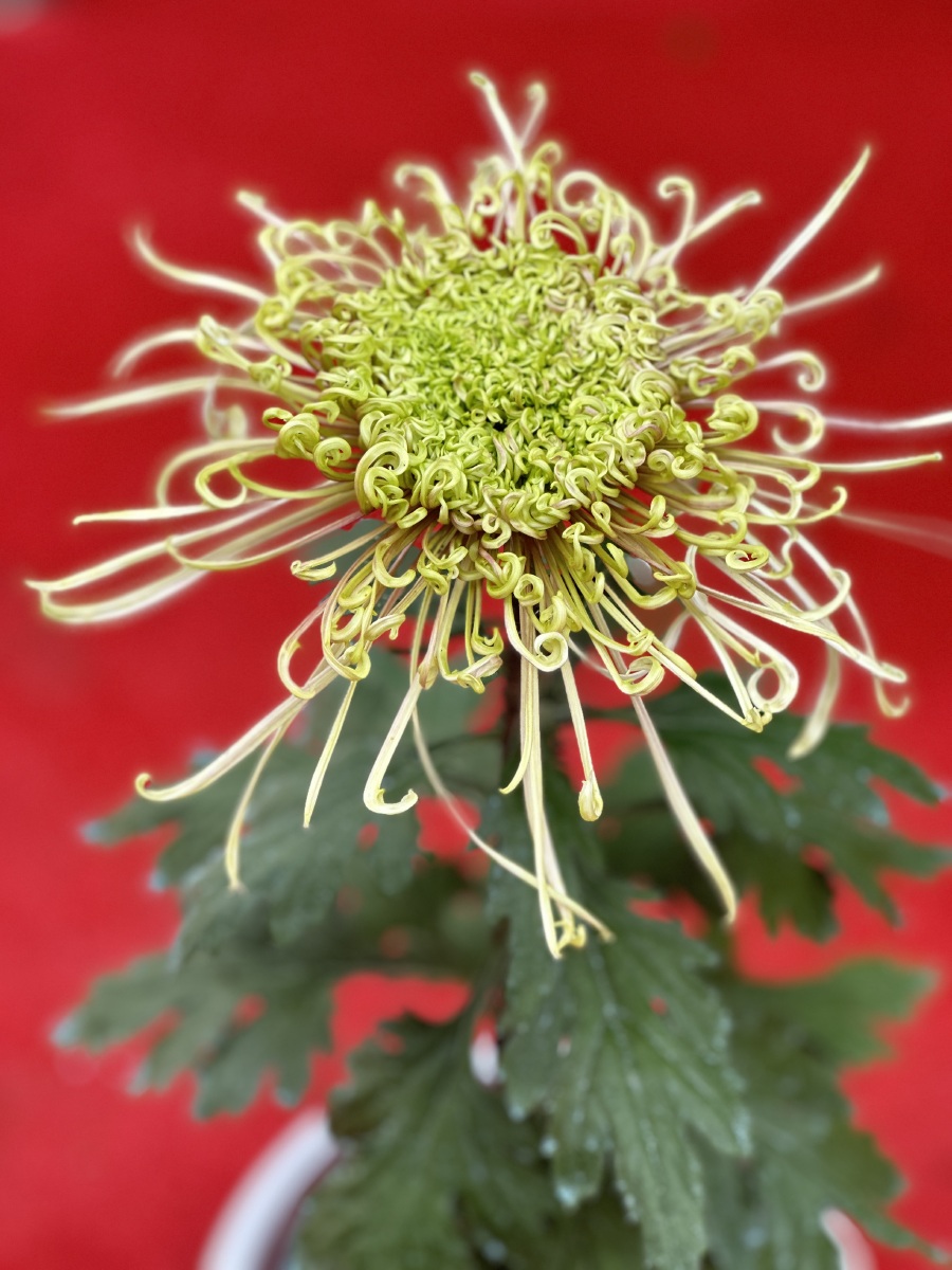 展台上,一株株独本菊傲然挺立。蜜蜡黄花瓣攒尖带釉光,霜青瓣舒展缀粉晕,金黄花瓣层层叠叠,叶片利落无杂色,在寒意的秋风中熠熠生辉。据介绍,独本菊栽培必须严格遵循古法——摘心控蘖、独留主茎,让所有养分化作一朵“一株一花”。
