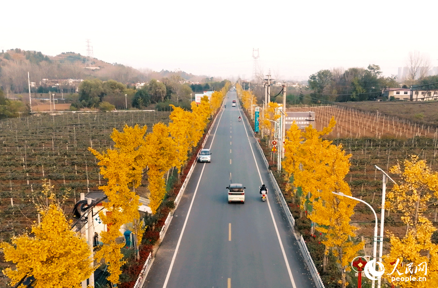 道路笔直地伸向远方,路边的银杏树正吐露着醉人的金黄。