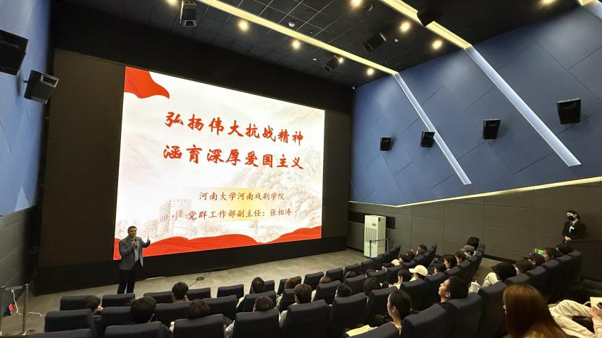 观影结束后,河南大学河南戏剧学院党群工作部副主任张相涛以"弘扬伟大抗战精神 涵育深厚爱国主义"为主题给学生上了一场别开生面的思政课,他强调要牢记习近平总书记的勉励,“以国家富强为念,以人民幸福为盼,忠心爱国、矢志报国,把个人小我融入国家大我,在为国尽责、为民服务中实现个人价值、展现人生风采”。这一解读帮助学生们从感性认知上升到理性思考,深刻理解了“小我”与“大我”的辩证关系,坚定了“四个自信”。