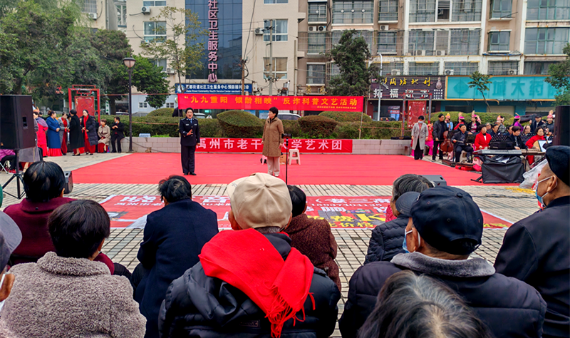 10月27日下午,禹州市南城门广场内人气十足、热情涌动,一场名为“九九重阳 银龄相映”的反诈反邪教科普文艺活动在这里火热举行。禹州市科协联合禹州市老干部局、禹州市老年干部大学,以老年人喜闻乐见的戏曲、小品、快板等艺术形式,将重要的反诈骗、反邪教知识送到他们身边。