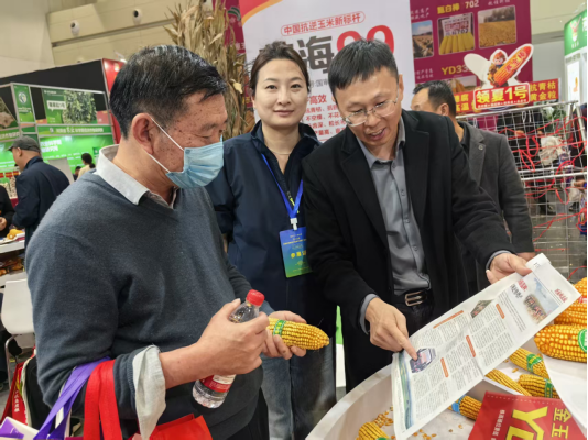 (年年丰种业工作人员在展会上推介年年丰1号等玉米品种)