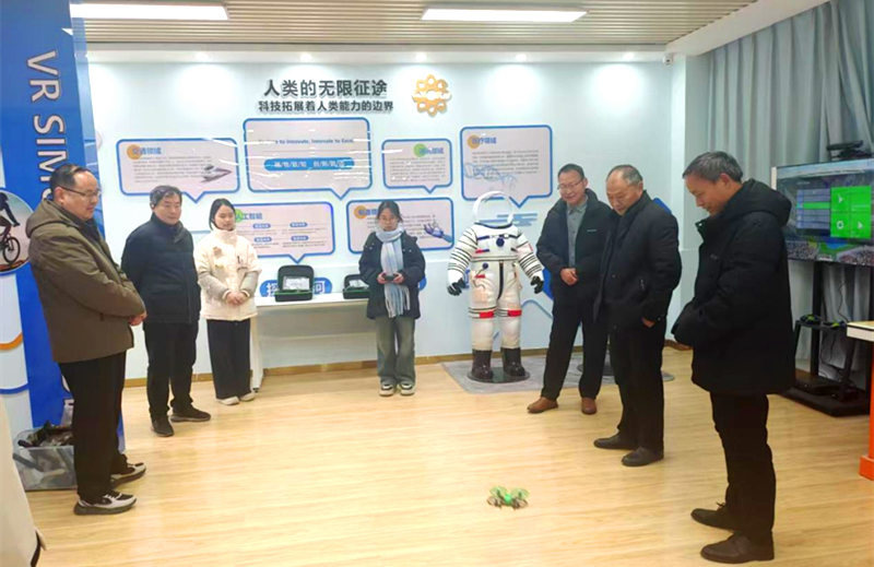 走进王店中学卓越农村中学科技馆,“载人航天精神”主题展区率先映入眼帘。高耸矗立的火箭模型极具视觉冲击力,“特别能吃苦、特别能战斗、特别能攻关、特别能奉献”的醒目标语,瞬间点燃了在场人员对宇宙探索的无限向往,让航天精神的传承氛围扑面而来。在“神舟飞船”VR体验舱前,班子成员亲自佩戴设备,沉浸式体验太空遨游之旅,在虚实交织的场景中直观感受我国航天事业的磅礴发展力量,深切体会到科技科普与前沿科技融合的独特魅力。