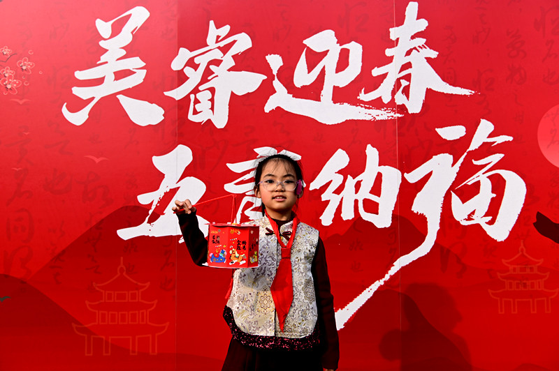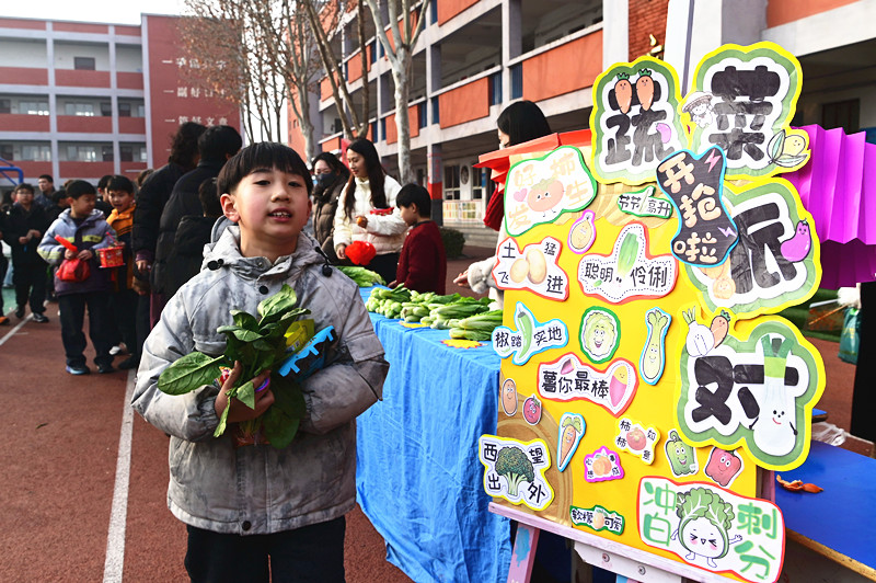 小学生在河南省沁阳市第二小学举办的“美睿迎春,五育纳福”为主题的校园迎春民俗庙会上选购“年货”。