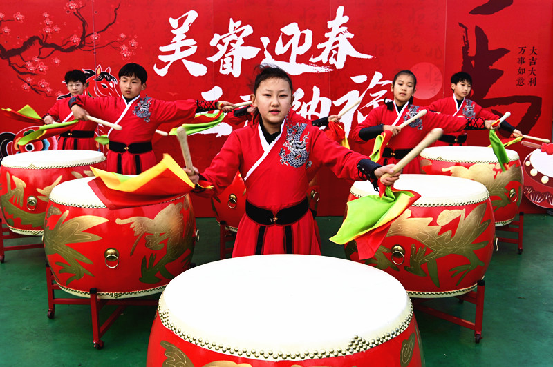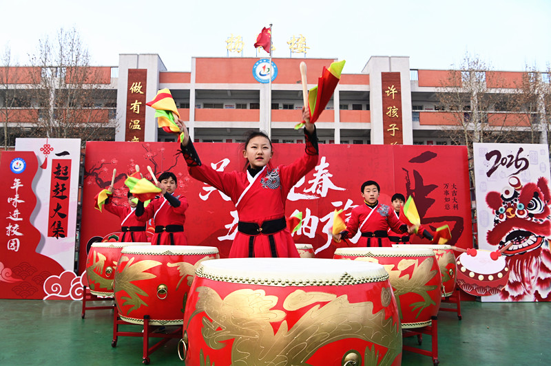 在沁阳市第二小学举办的“美睿迎春,五育纳福”为主题的校园迎春民俗庙会上,小学生表演“鼓舞”为庙会助兴。