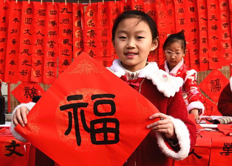 王艺萱小朋友在河南省沁阳市第二小学举办的“美睿迎春,五育纳福”为主题的校园迎春民俗庙会上展示自己写的“福”字。