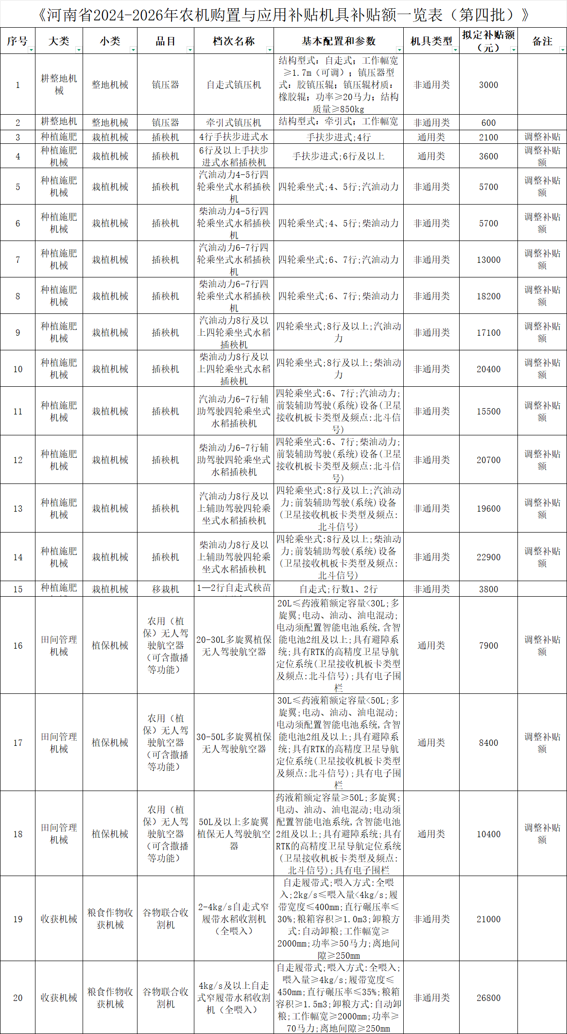 《河南省2024—2026年农机购置与应用补贴机具补贴额一览表(第四批)》