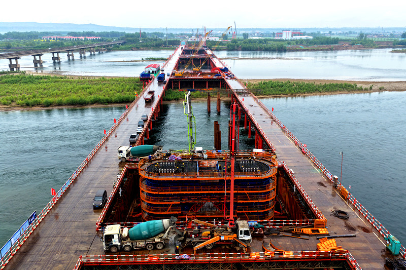 目前,主桥剩余3个水中墩施工正加速推进,确保在汛期前全部出水,钢梁架设前期准备工作同步有序开展。焦平铁路洛阳黄河公铁大桥全长13.36公里,采用上层双向八车道国道、下层双线350公里时速高铁的双层合建模式,其主桥4×180米连续钢桁梁结构,创下国内同类型桥梁最大跨度纪录。