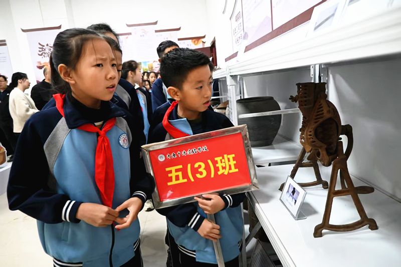 揭牌仪式后,200余名五年级学生在老师的带领下有序参观了农耕文化馆。馆内陈列的曲辕犁、古代量具、日晷等实物展品,直观再现了传统农耕文明的发展脉络。学生们驻足凝视、轻声交流,在触摸历史器物、观察传统工具的过程中,真切感受古人的生活智慧与劳动创造力,对农耕文化的起源与发展有了更鲜活的认知。