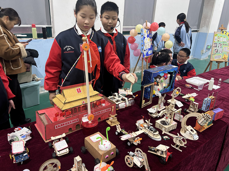 同学们化身环保小卫士,让废旧物品上演"变形记"。硬纸板变身华丽的过山车,泡沫塑料组装成炫酷的驱逐舰等。每一件作品都凝聚着学生的智慧,更融入了科学知识,他们在广袤的想象空间施展特长,独创一格,展示属于自己的成果。
