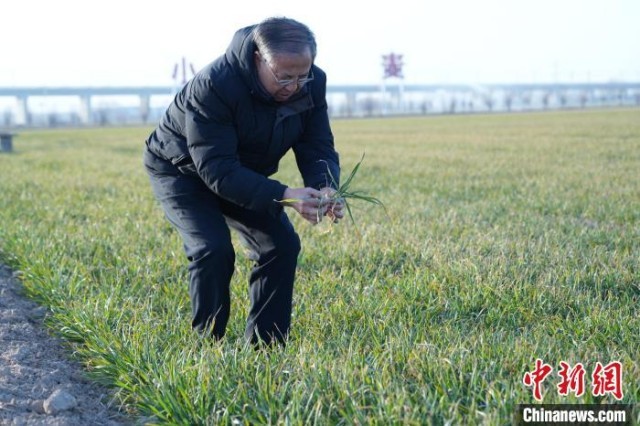 茹振钢在麦田里察看苗情。 中新社记者 阚力 摄