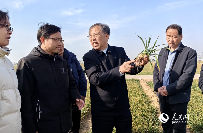 茹振钢与他的学生及当地种粮大户交流麦苗生长情况。人民网宋芳鑫摄
