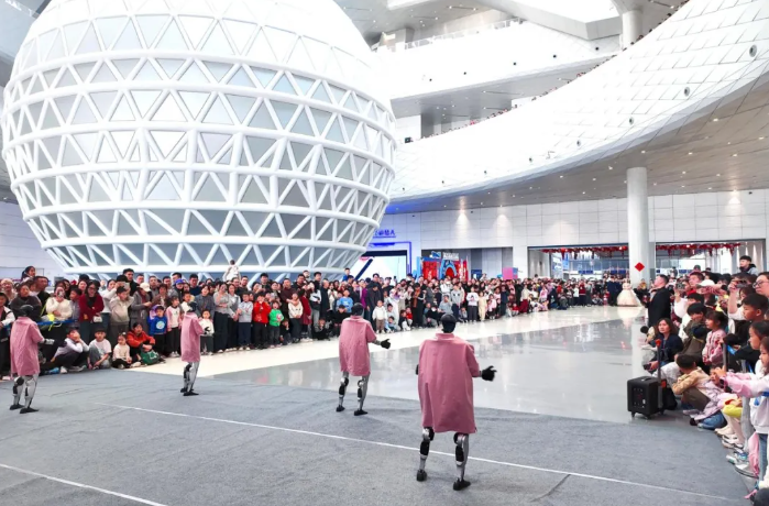 一层中庭年味浓浓。宇树机器人化身新春使者翩然起舞,尽显科技之美;“科科公主”巡游与观众亲切互动、问答送福,展厅内欢声笑语不断;《金色时光》舞蹈快闪活力上演,科技辅导员的灵动演绎,让传统年味与现代科技同频共振,勾勒出一幅生动鲜活的“科技中国年”画卷。