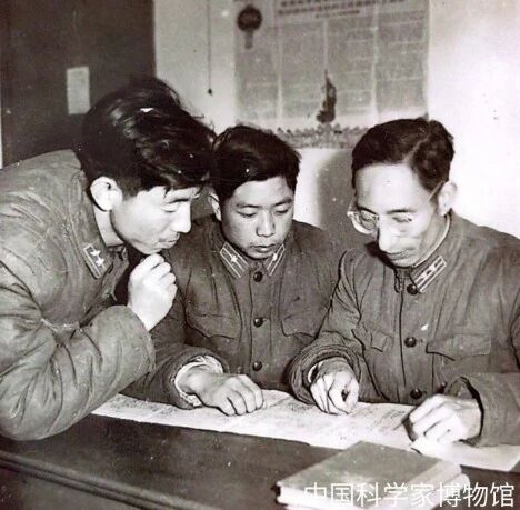 张履谦(右1)和同事进行研究工作(来源丨中国科学家博物馆)