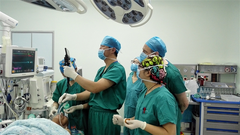 张加强(左二)带领团队给患者做气管插管纤维支气管镜定位。受访对象供图