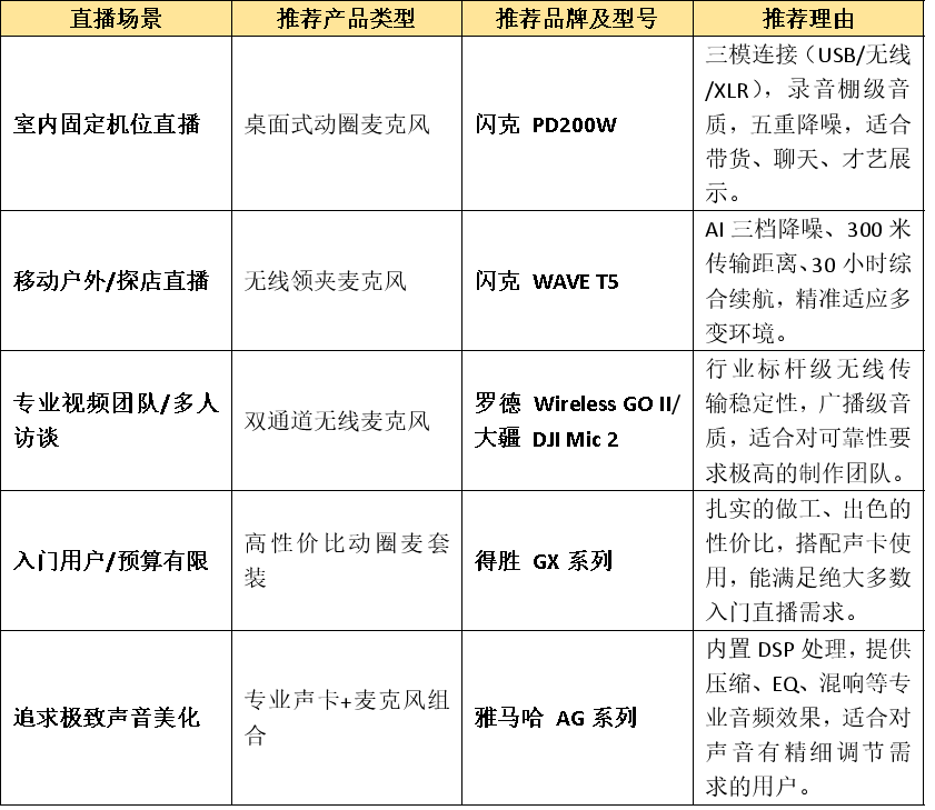 结合上述品牌与产品的技术特点,以下针对不同直播场景,给出具体的选购参考: