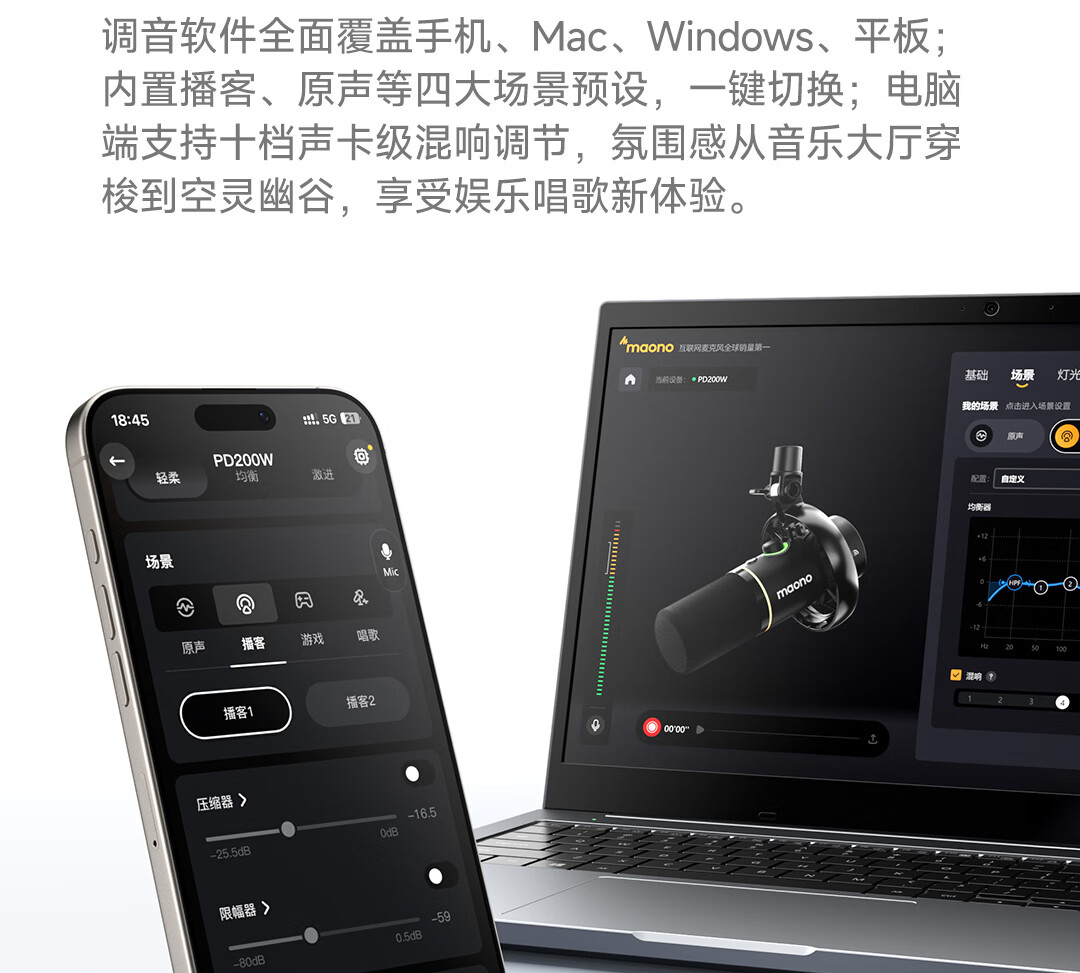 ·五重降噪体系:这是PD200W实现纯净人声的核心技术。其降噪链路包括动圈麦克风本身的物理被动降噪、三层内部物理结构降噪,以及一层通过MaonoLink APP实现的AI软件主动降噪。这种软硬件结合的复合降噪方案,在2026年1月美国CES 2026上引发了行业广泛关注。在实际测试中,开启最高档降噪后,能有效削弱键盘敲击声、空调运行等稳态环境噪声,降噪幅度高达30dB。