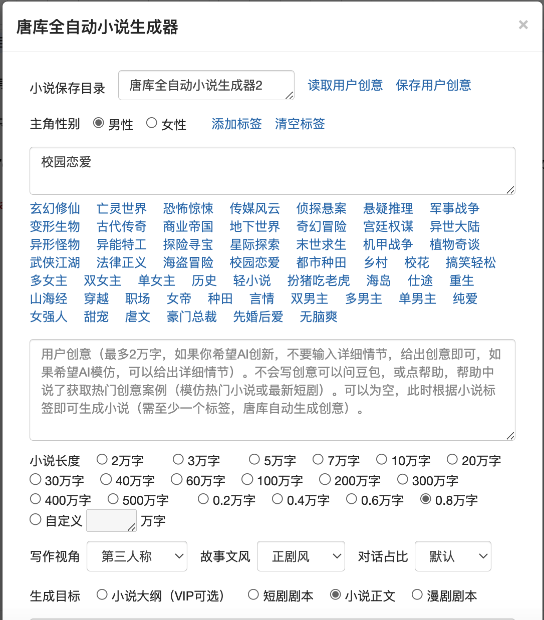 唐库是一个专业写小说/剧本的Agent, 可以一键生成1-500万字的小说/剧本,它有如下功能:1,全自动生成1-500万字的小说,用户提供简单创意即可;2,同步生成完善的小说大纲及每章摘要,全部角色人设卡;3,支持生成各种长度的短剧剧本,漫剧剧本,小品剧本,短视频剧本。