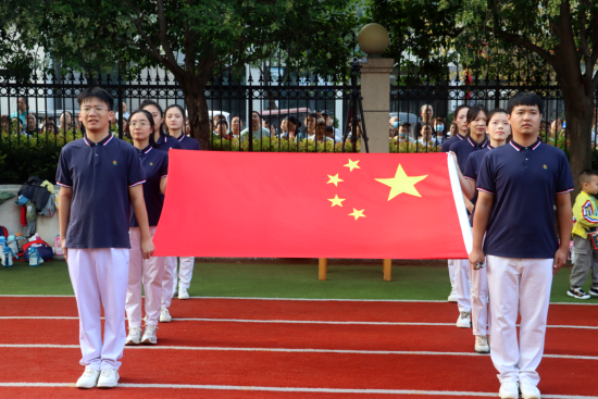 当庄严的国歌奏响,护旗手们迈着坚定的步伐,护卫着五星红旗徐徐入场。全体师生肃立行注目礼,在晨光中完成了一场充满敬意的升旗仪式。