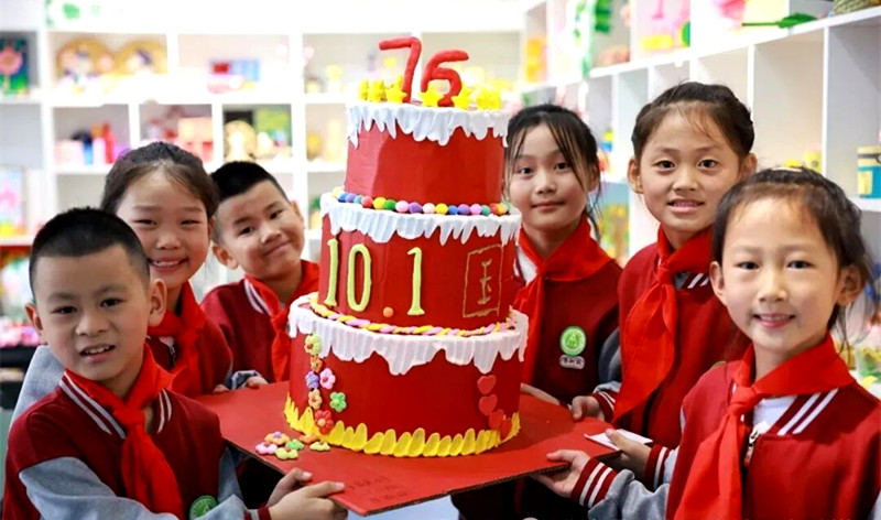灵宝市故县镇安家底小学的孩子们巧做蛋糕迎国庆。