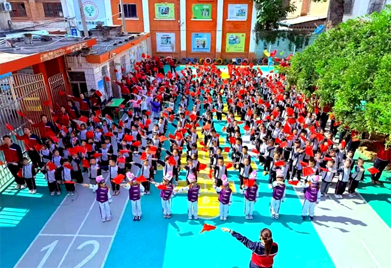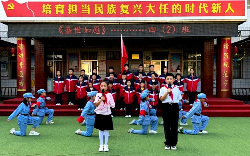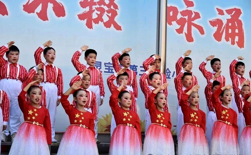 灵宝市第二小学的孩子们齐声高唱红色歌曲,稚嫩嘹亮的歌声里,满是对祖国母亲的礼赞与祝福。