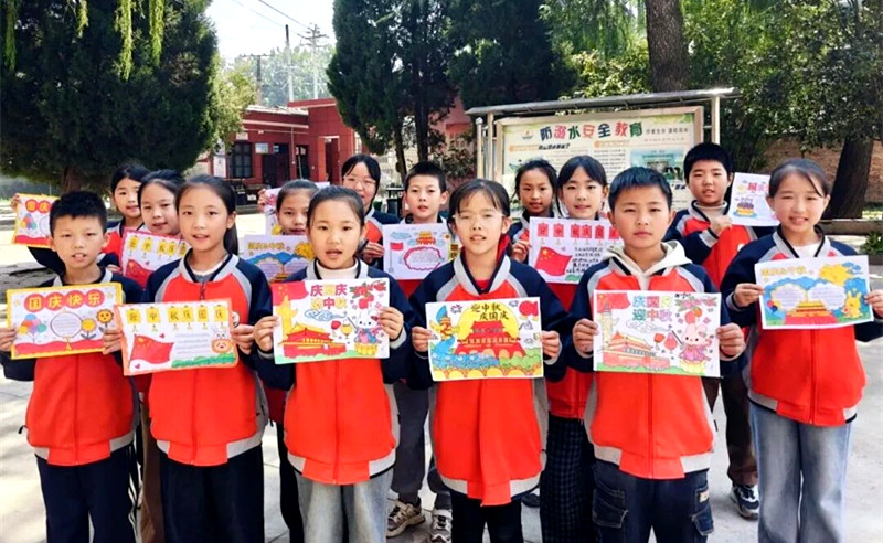 灵宝市阳平镇九营小学以“童心向祖国”为主题,开展国旗绘制与手抄报创作。
