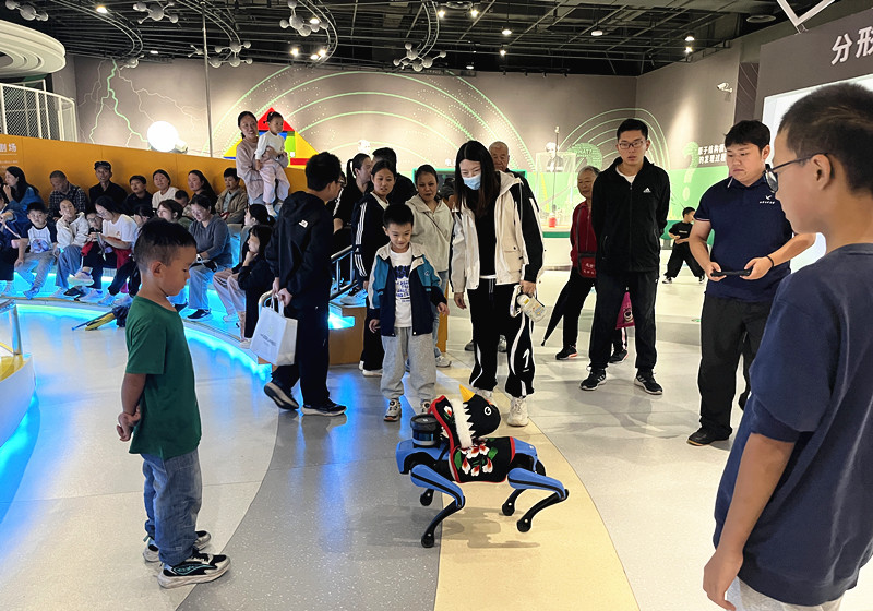 每天上午10点、下午4点,“明星导览员”机器狗一出场就被团团围住。它身着泥咕咕的萌宠衣服,迈着小短腿带观众逛展厅,还能俯冲奔跑,萌化了无数“童趣心”。小朋友们追着它合影,大朋友们则掏出手机拍个不停,朋友圈里全是“科技馆机器狗比我家娃还听话”的调侃。有家长说:“本来是带娃来学知识,结果被机器狗圈粉,现在天天问什么时候还能再见到它。”